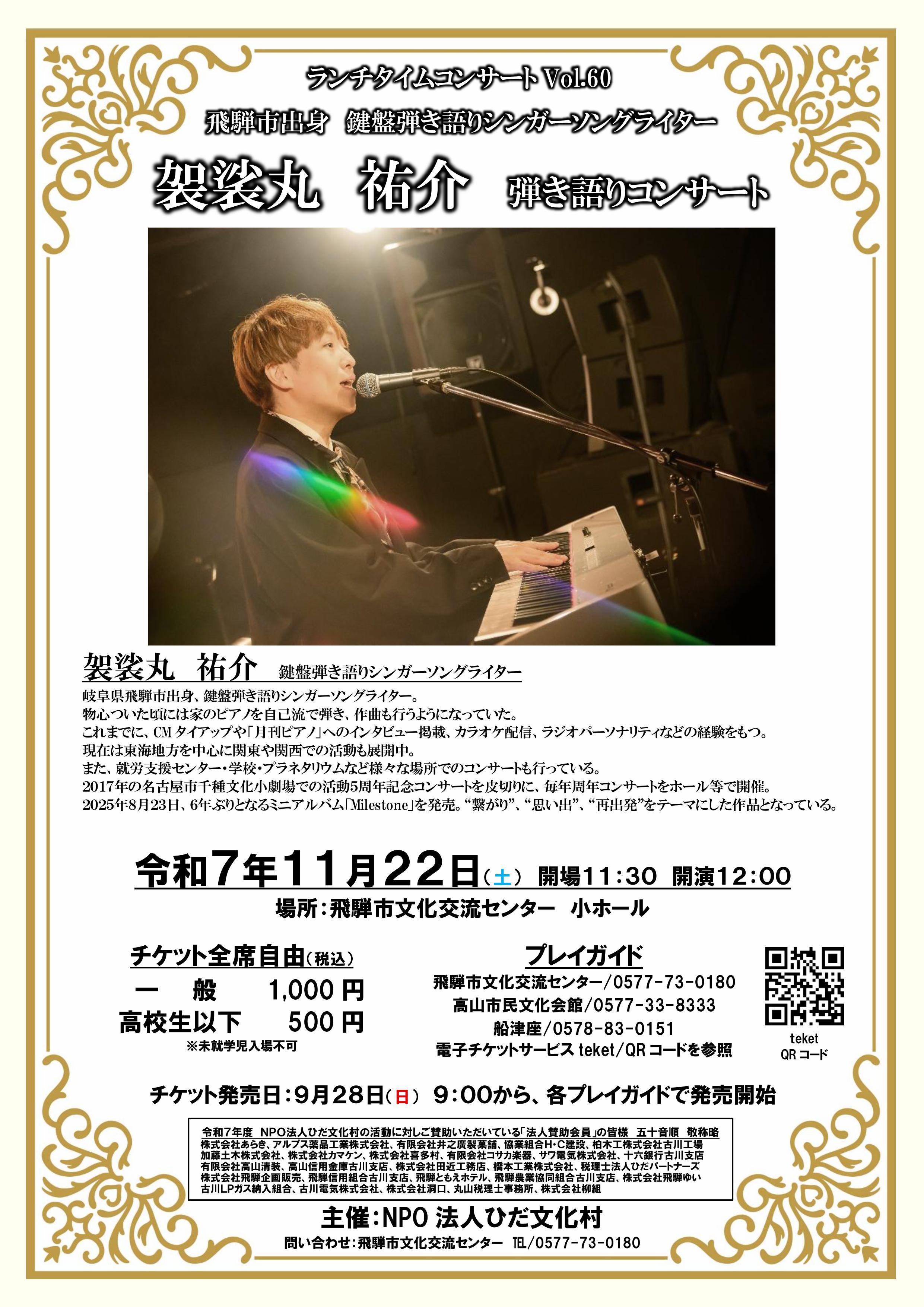 新しいコンサートのお知らせです。 ランチタイムコンサートVol.60 飛騨市出身 鍵盤弾き語りシンガーソングライター 袈裟丸 雄介 鍵盤弾き語りコンサート 日時:11月22日(日) 開場11:30 開演12:00 場所:飛騨市文化交流センター 小ホール チケット全席自由:一般1,000円/高校生以下500円 ※未就学児入場不可 チケット発売日:9月28日(日)9:00より、各プレイガイドで発売開始 プレイガイド 飛騨市文化交流センター/0577-73-0180 高山市民文化会館/0577-33-8333 船津座/0578-83-0151 電子チケットサービスteket/ポスターQRコードを参照して下さい。 ※電子チケットサービスteketは準備でき次第公開いたします。 その他お問い合わせにつきましては、飛騨市文化交流センターまでお問い合わせください。